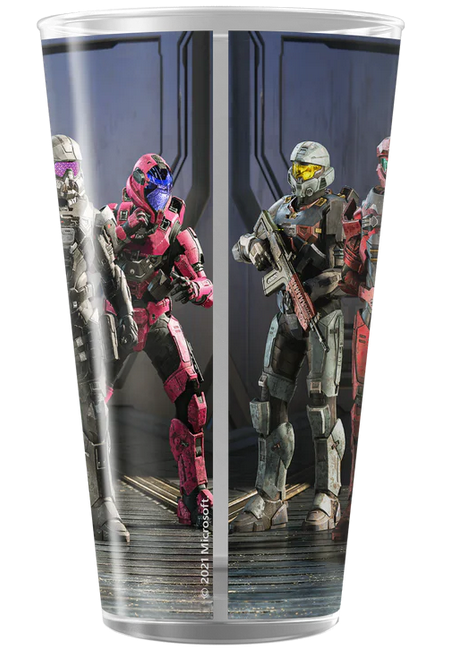 The Halo Infinite team stresses the importance of staying hydrated while playing games. This glass, with a wrap-around print is perfect for water breaks between missions and matches.
